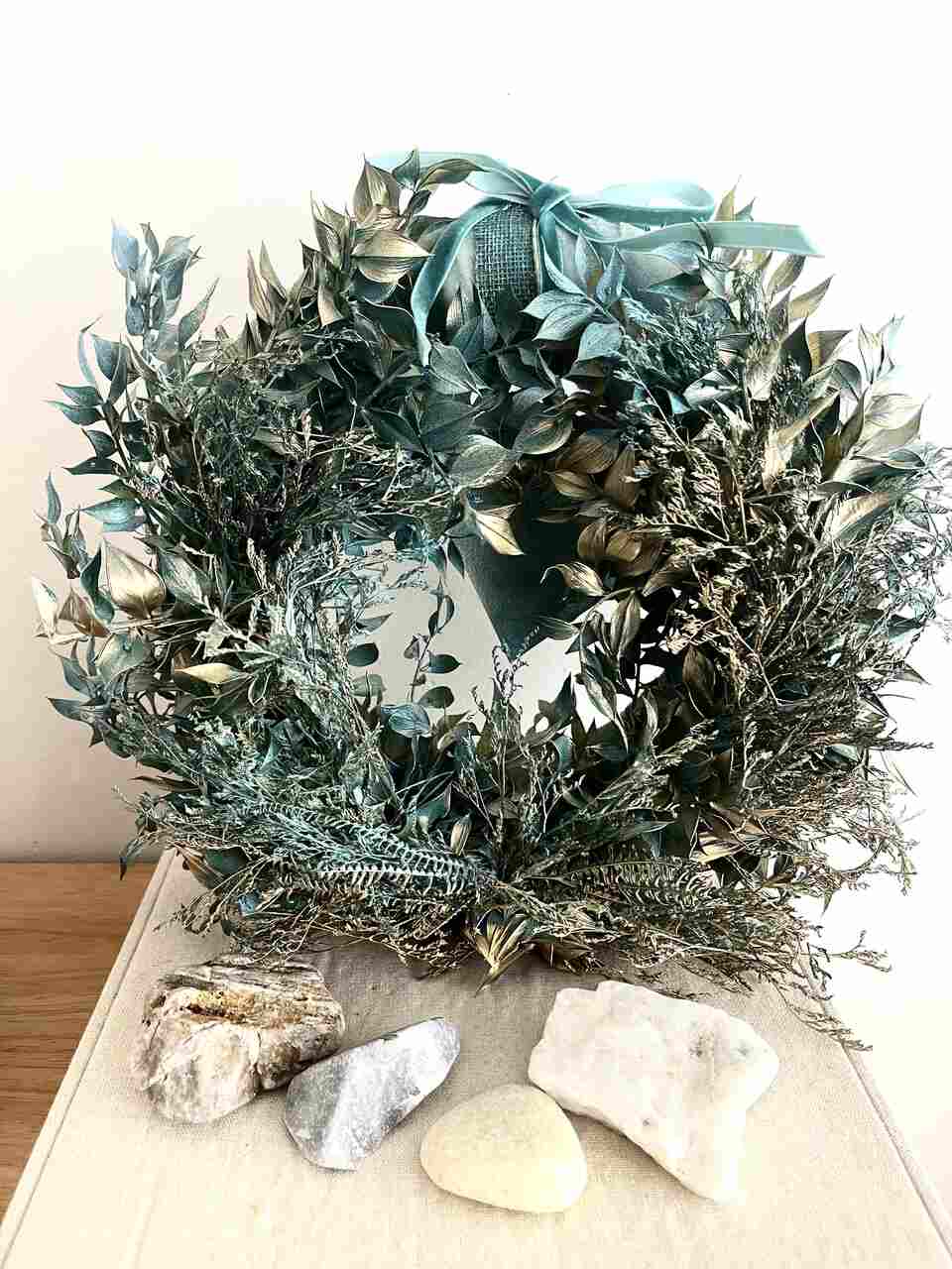 Corona  ruscus preservada en color verde empolvada y dorado, forrada de terciopelo con lazo de terciopelo, hecha a mano