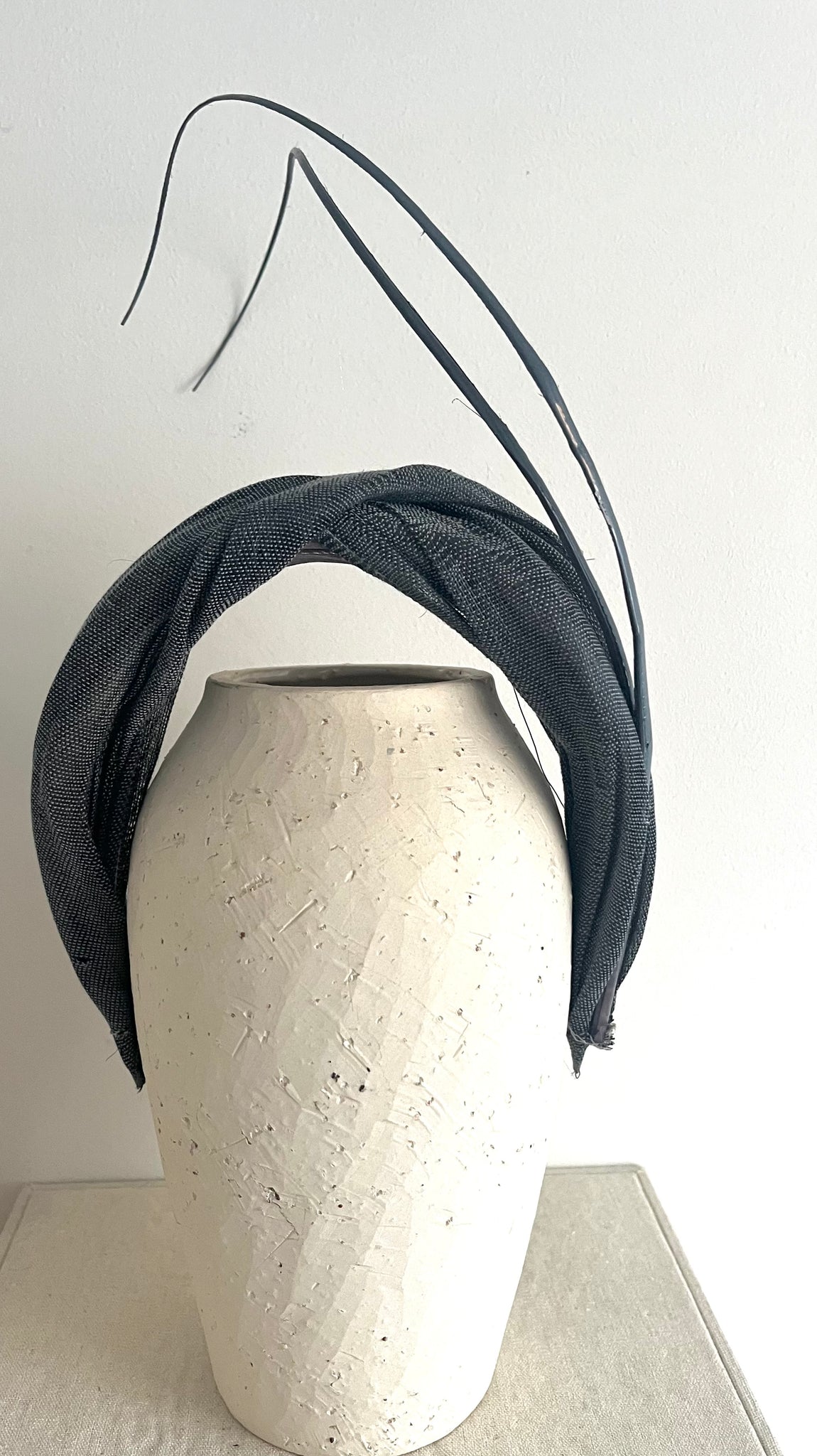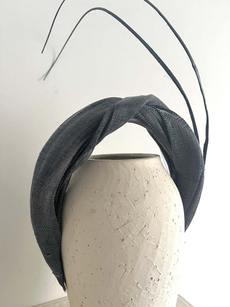 Diadema gris plomo azulada, tejido sinamay de seda teñido con raquis en gris plomo.