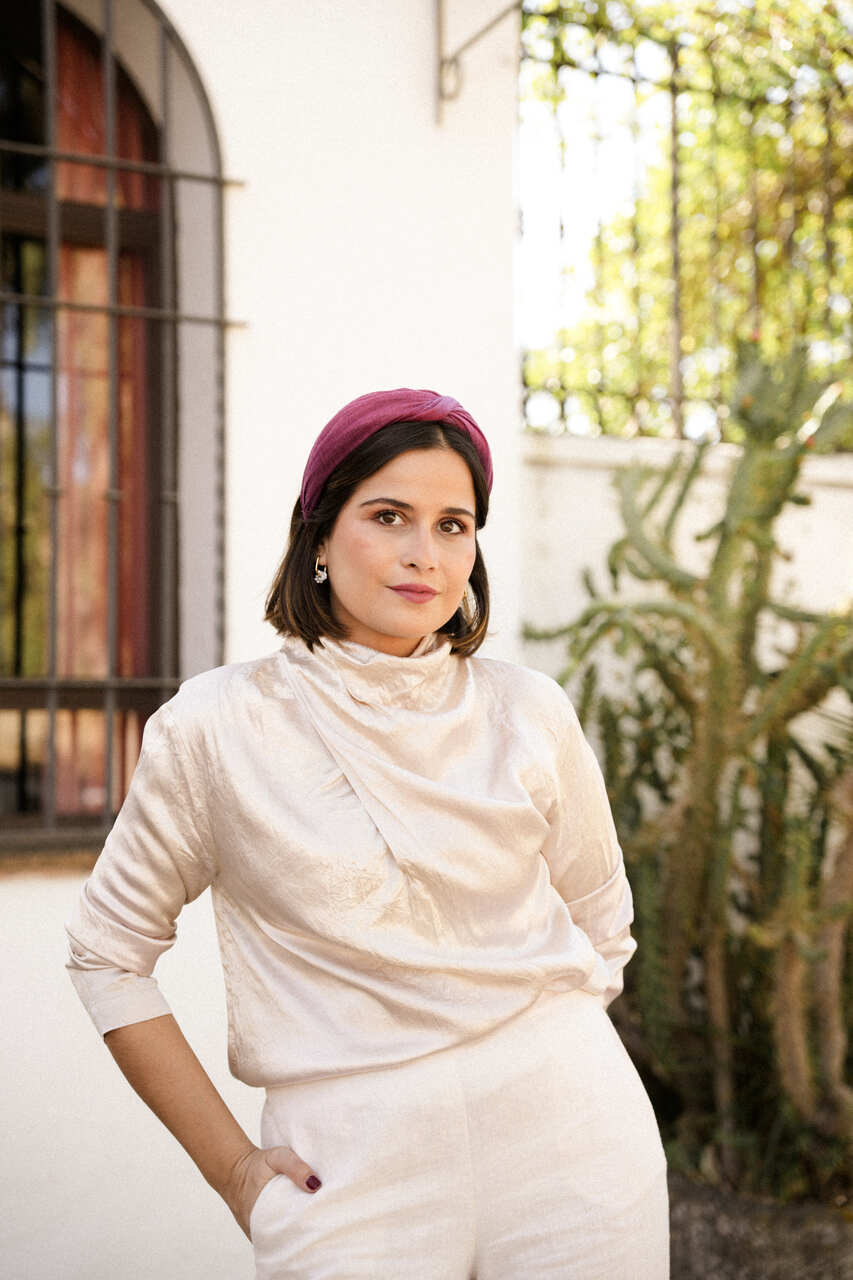 Diadema cruzada parte central, realizada de sinamay de seda.