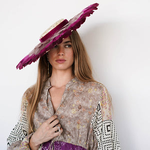 Pamela de plumas de pato en tonos vino, buganvilla y malva empolvado