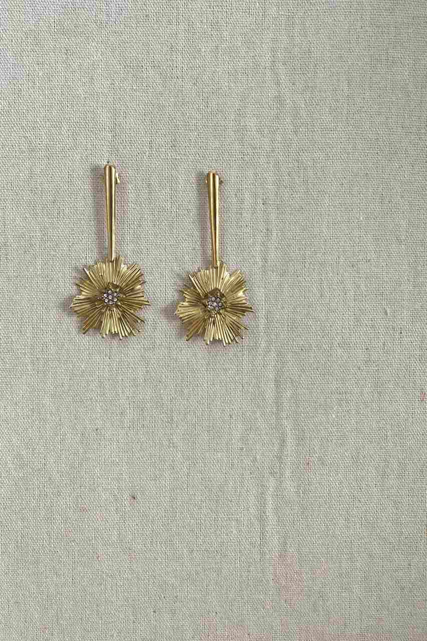 Pendientes largos con flor de latón colgante y estrella central.