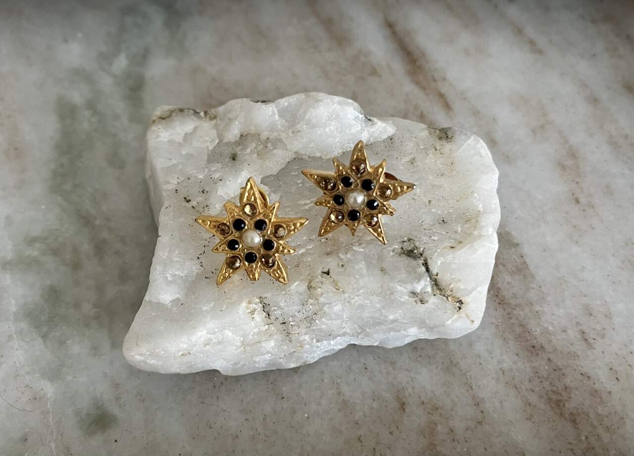 Pendientes de latón estrella central con piedras de cristal y perla en el centro con cierre de presión