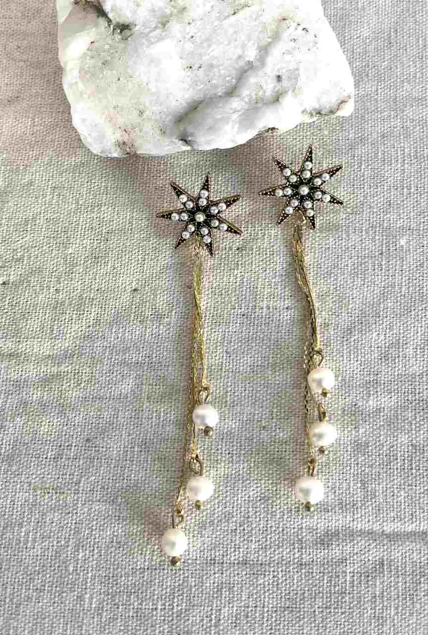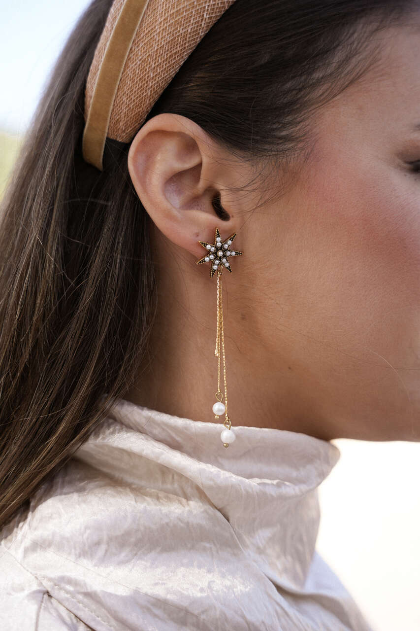 Estos pendientes en forma de estrella, acompañados de una delicada cadena colgante con perlas, combinan elegancia y sofisticación. Perfectos para realzar cualquier look, su diseño detallado ofrece un toque de brillo sutil y un acabado refinado. La combinación de la estrella y las perlas aporta un equilibrio entre modernidad y clasicismo, ideal para ocasiones especiales o para añadir un detalle distintivo a tu estilo diario.