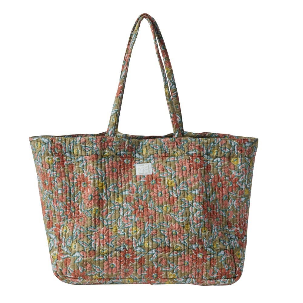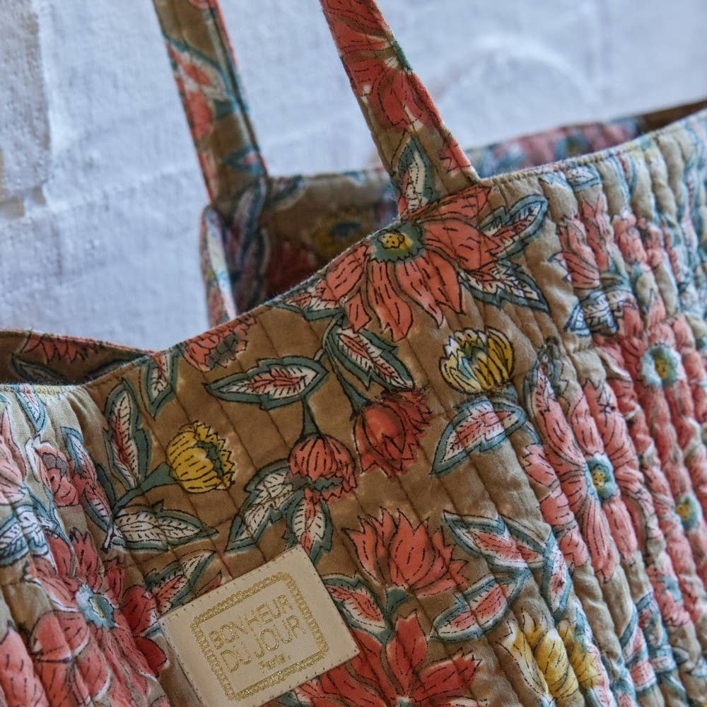 Un bolso flexible, ligero, generoso, que se desliza sobre el hombro para escaparse un fin de semana, ir a la playa o simplemente enfrentar el día con estilo. Con sus fuelles anchos, acoge todas tus cosas (¡o las de los niños!), y su acolchado suave lo hace aún más agradable de llevar. Nos encanta: – Sus estampados exclusivos, inspirados en las flores indias – Su confección artesanal en block print y pigmentos naturales – Sus asas largas ultra cómodas – Su formato perfecto entre flexibilidad y capacidad Dimensiones: 36 × 45 cm – Fuelles laterales 18 cm – Asas 58 cm Composición: Popelina estampada 100 % algodón – Relleno 100 % poliéster Un bolso simple e ingenioso, que sigue a toda la tribu en el día a día.