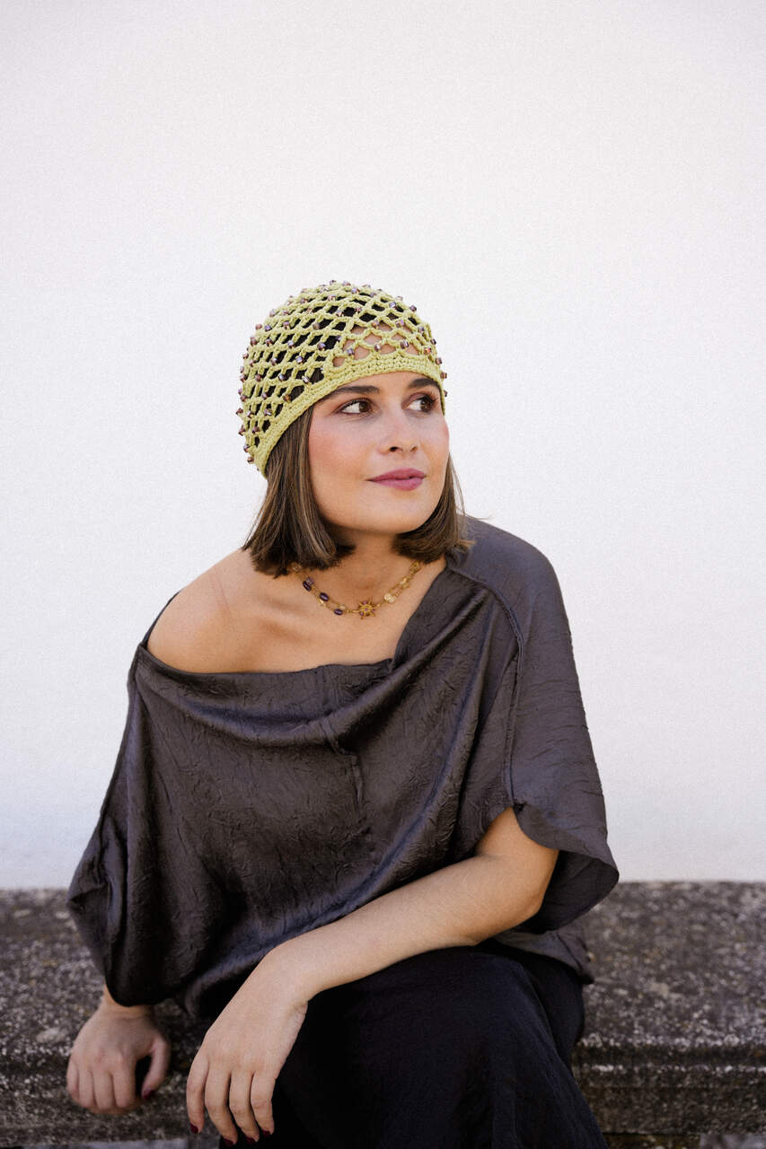 Este casquete de crochet ajustable combina la técnica artesanal con detalles en pedrería que aportan un toque elegante y sofisticado. Su diseño adaptable garantiza un ajuste cómodo y seguro, mientras que la combinación de materiales mejora la durabilidad y el estilo. Ideal para realzar cualquier peinado.