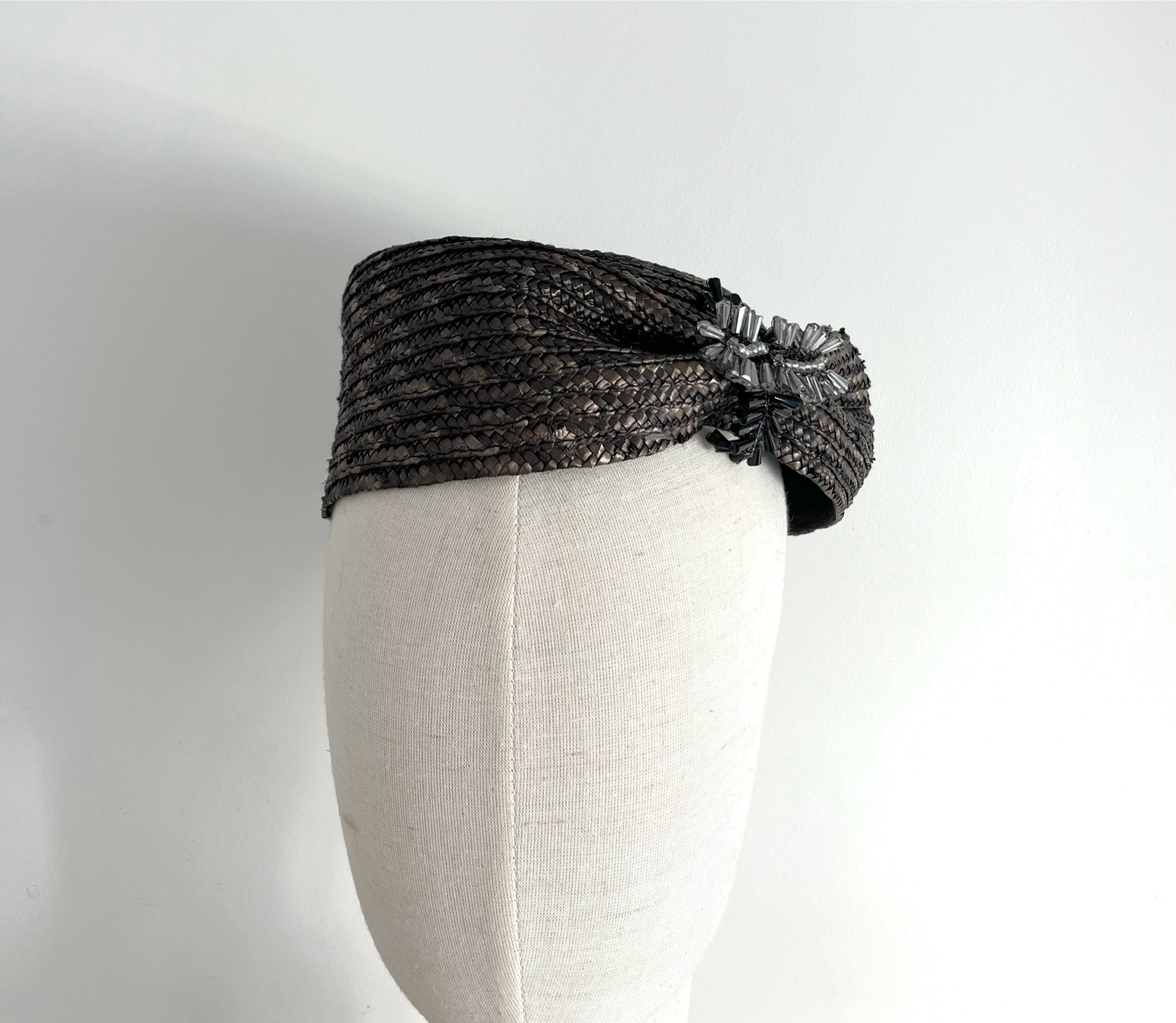 Casquete invitada paja en tono negro amarronado. Con goma para sujetar y afianzar en el peinado.